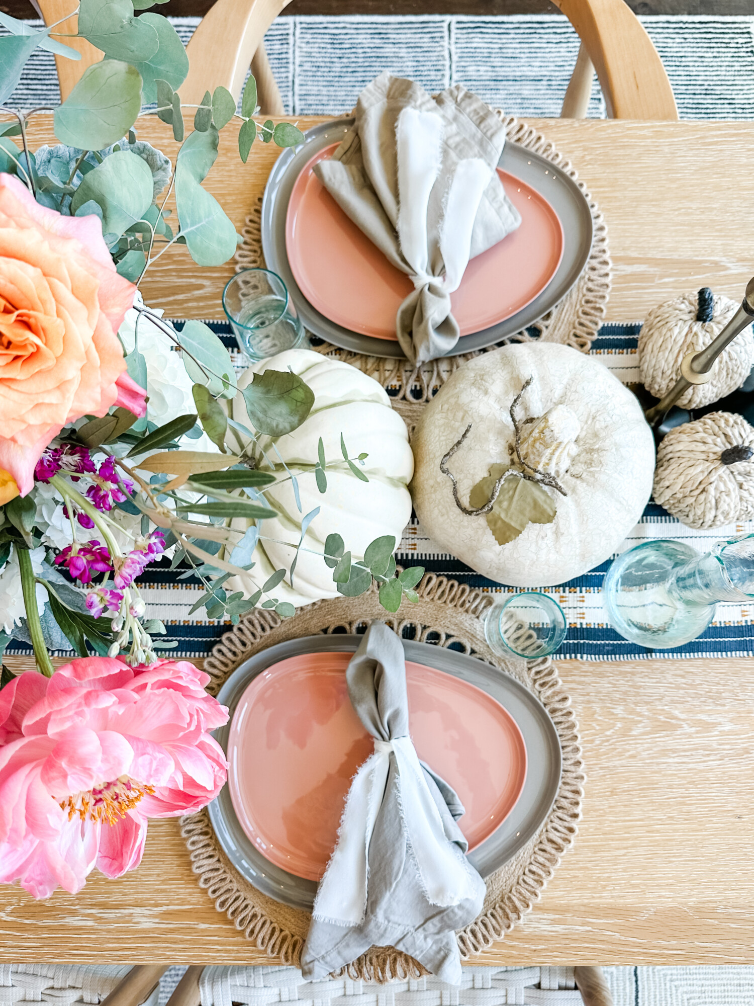 Pro tip: Don’t be afraid of adding your personal touch. You can infuse your table with unexpected colors to add a playful flair to the festive ambiance, like I did here. Introduce soft and muted pastel hues like blush pink, vintage blue, or lavender to infuse an air of tranquility and grace.