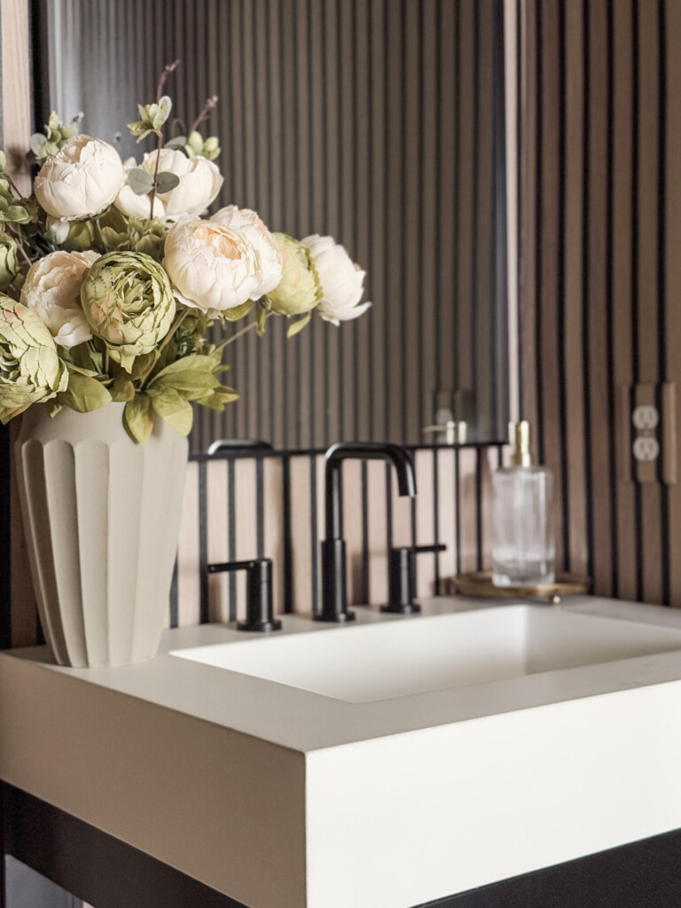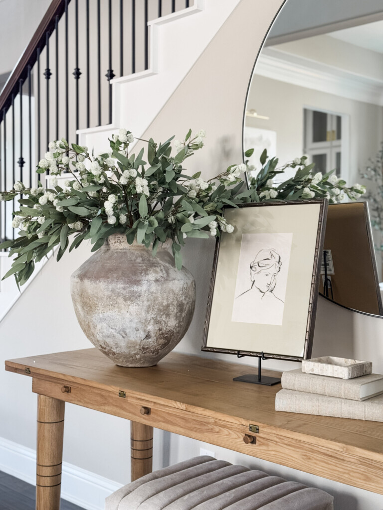 Soft blush and white florals are an easy way to bring spring indoors. The gentle pink adds warmth without feeling bold or overpowering. Styled in a simple stone vase and paired with natural wood, layered fabrics, and a subtle floral pillow, the blooms add freshness and softness while keeping the space simple and refined. I also love using faux flowers that look incredibly realistic. This gives you that fresh seasonal touch without the upkeep.