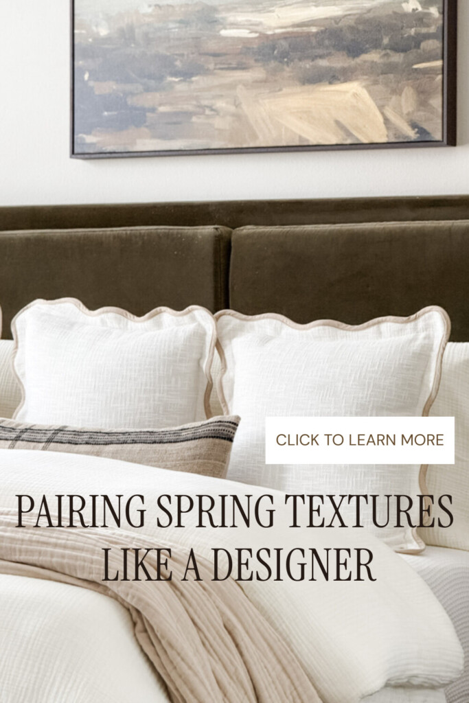 Spring doesn’t have to mean bold color. When you’re working with softer colors, the magic is in the layering. Think linens, soft florals, gentle pastels, and delicate details like scalloped pillows to add depth without overwhelming the palette. By mixing textures instead of colors, you create a space that feels fresh, airy, and beautifully refined — all while staying true to a calm, neutral aesthetic.