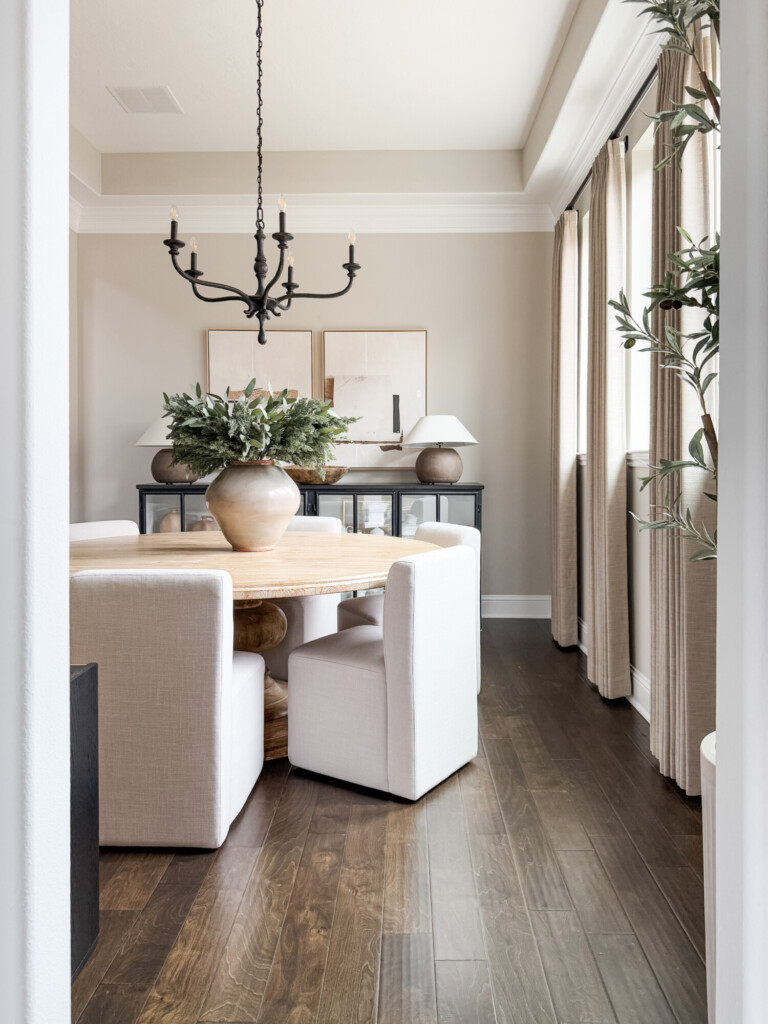 The dining area is built around simplicity. A timeless table and chairs that can shift with the seasons. Swapping florals or small details is an easy way to refresh the space without changing the core pieces.