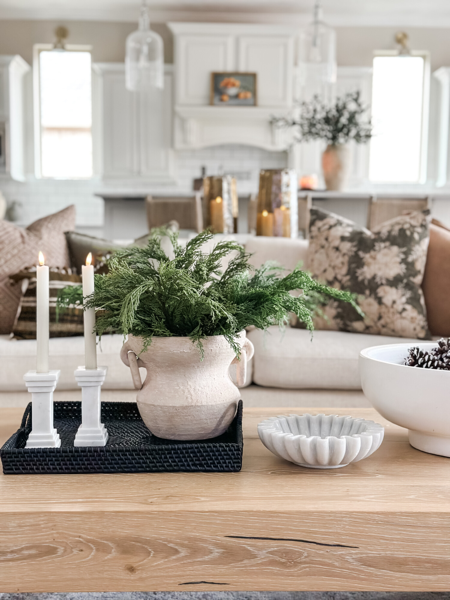 While Texas doesn’t get too many white snowy days, the thought is bringing that winter feeling into your home. Winter décor should highlight your existing décor, by incorporating a clean, crisp, and neutral color pallet. The beauty of neutral tones is its ability to fit so seamlessly into your home. Some of your favorite holiday accessories can double as winter décor, by simply removing the obvious holiday decor. That bowl you filled with ornaments can be switched out for pinecones.